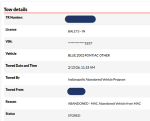 On February 13th, 2026, Tony awoke to find his 2002 Pontiac Montana van missing from his yard. After reviewing footage from his Ring doorbell camera, he discovered that the van had been towed away on a flatbed while he was sleeping.[17] Shortly thereafter, Tony uploaded a string of videos complaining about the incident. Initially, it was suspected that this was an illegal vehicle theft. However though, after making an inquiry with the Indianapolis Police Department, Tony would find out later that same day that the police ordered the vehicle to be towed after it had evidently been reported as abandoned. According to Tony, no one had informed him beforehand that his vehicle was to be towed, either by mail or phone call, and the tow truck driver did not knock on Tony's door to inform Tony that his vehicle was being towed. The van is currently being held in storage.